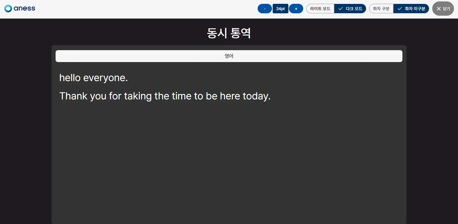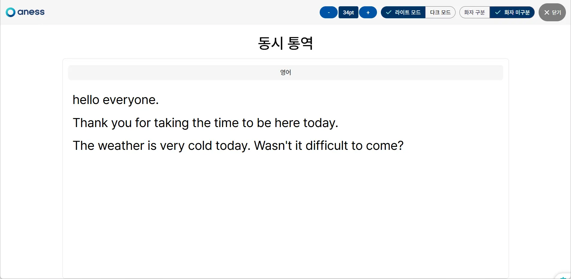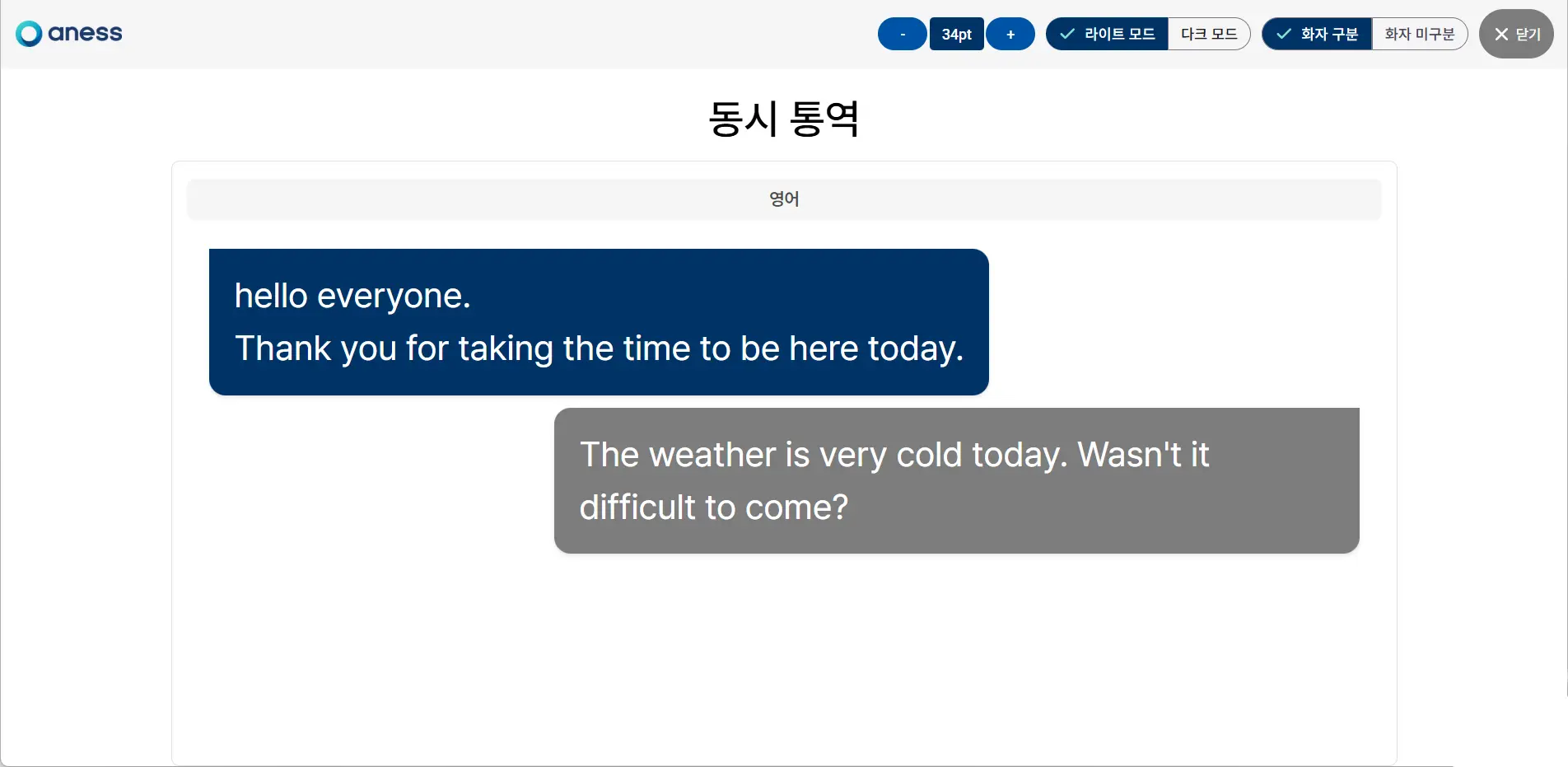 발표자나 강의가 바뀌어 새로운 내용만 보이게 하고 싶은데 종료 후 재시작하기 번거로우셨다고요? 이제 기존 발화 내용을 지우고, 일시정지를 했다가 재시작 해보세요🗑️ 통역창을 나가지 않아도 화면을 정리한 뒤 새로 시작할 수 있습니다.