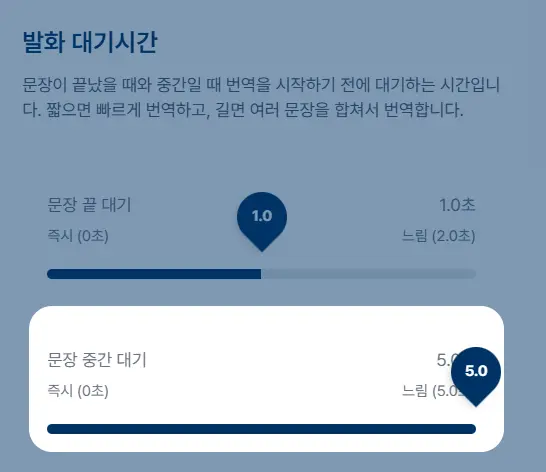 여러 문장을 발화할 때 문장 별로 구분하는 대기시간입니다. 발화 속도가 빠를 때 여러 문장을 계속 이야기하면 받아쓰기만 작동하던 현상을 개선했습니다👍 이 시간을 짧게 설정하면 문장과 문장 사이 생기는 공백 시간이 짧아도 문장을 구분 지어주는 기능입니다.